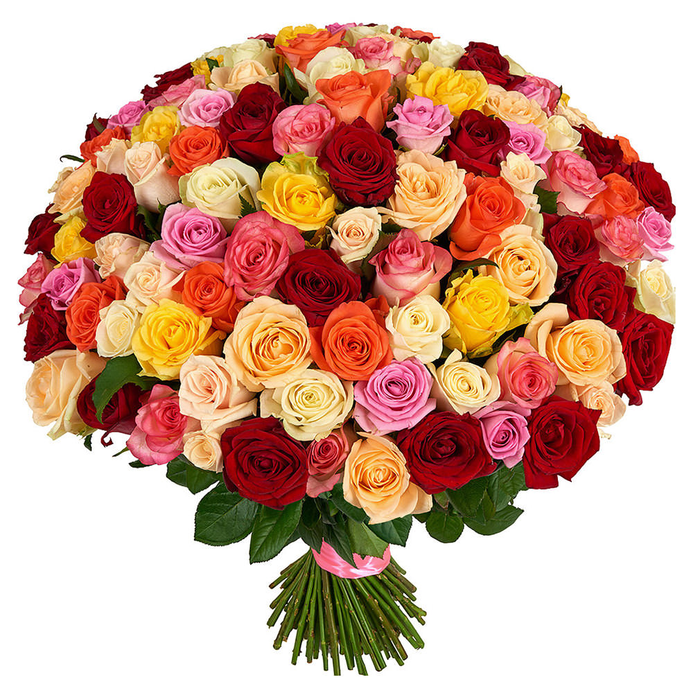 Роза Россия микс (кремовая, желтая, оранжевая, красная, розовая).